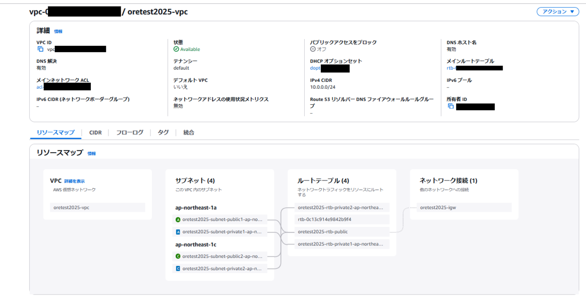 - 以下の指定でVPCと関連リソースを作成。名前タグの自動生成には「oretest2025」を指定。