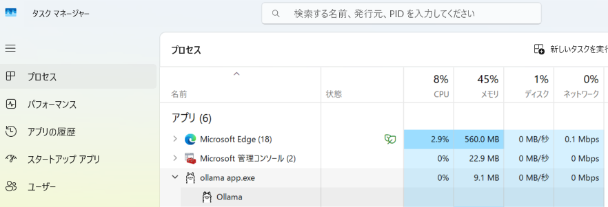 1.Ollamaは「ollama app.exe」であることをタスクマネージャより確認した。