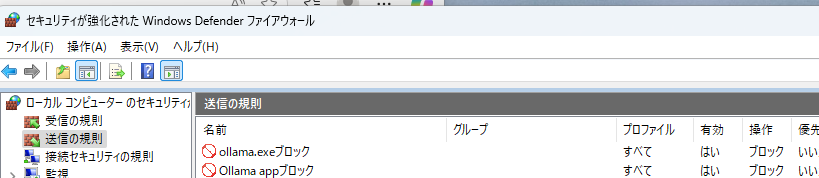 ollama app.exe、ollama.exeは、C:\Users\ユーザー名\AppData\Local\Programs\Ollama 配下にあるので、それぞれのexeについて、送信と受信をブロック設定。